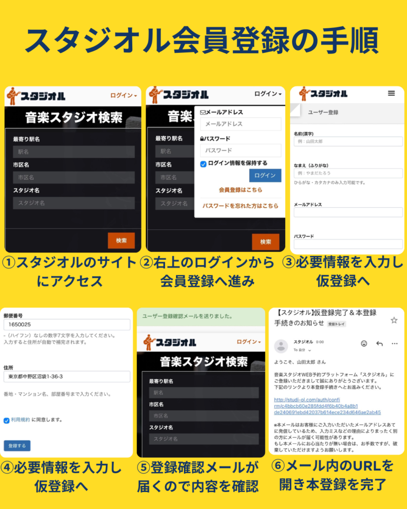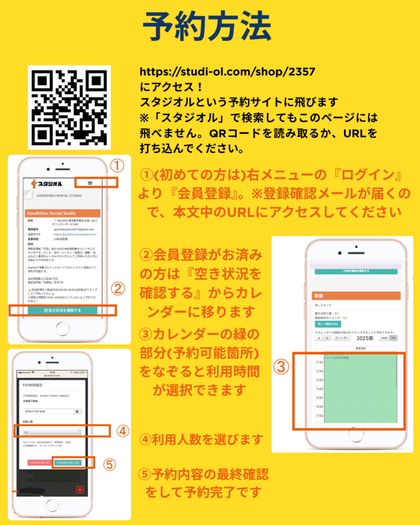 STEP1 予約サイト【スタジオル】会員登録&空室状況確認