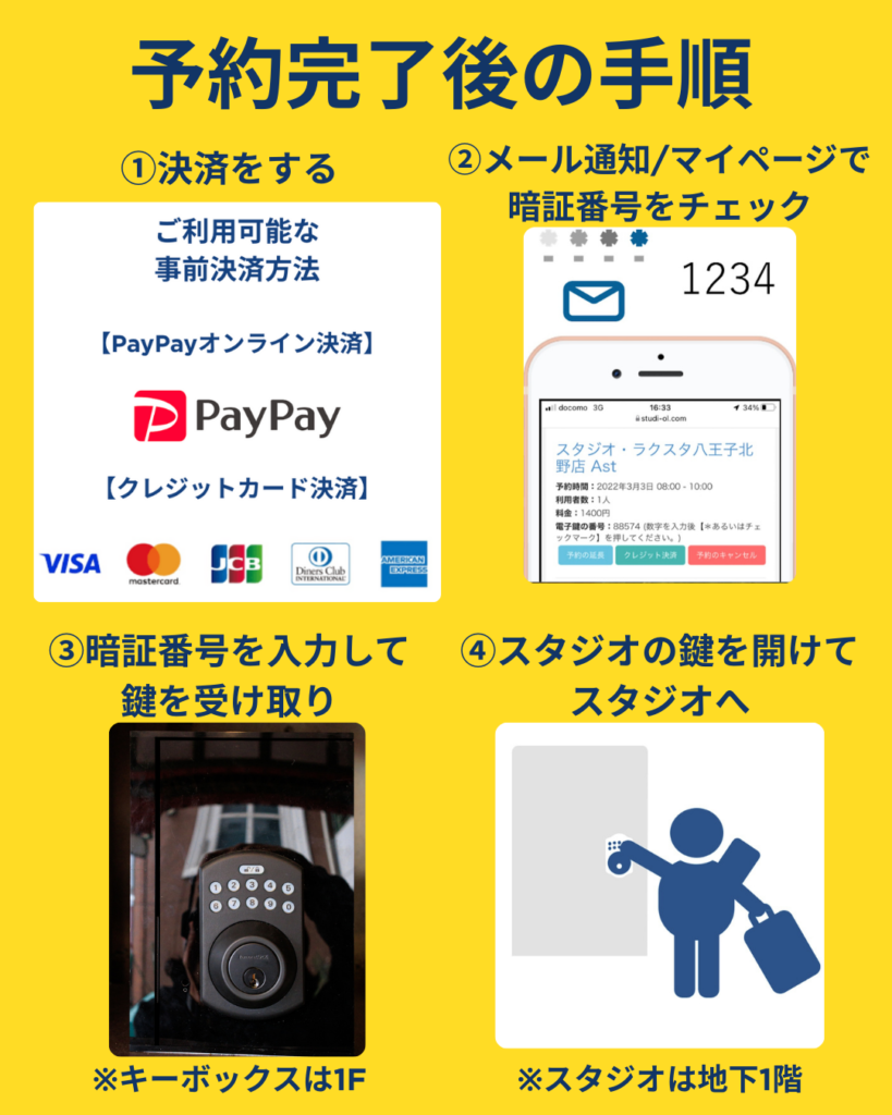 ・予約完了時に届く予約メールに記載の暗証番号で1階に設置したキーボックスから鍵を取り出し、エレベーターでB1階へ進みスタジオへご入室ください