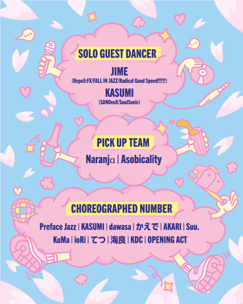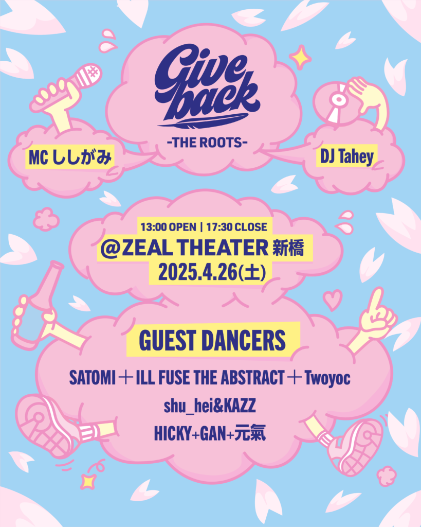 今までダンサー界で多くの経験を積んできたダンサーさんと、新しい世代が繋がるイベントとなっています。GIVE BACKよりも少人数のナンバー作品になっており、DJ TIMEでお酒を飲みながら楽しく踊ってもらえるような規模で、このイベントの開催いたします。